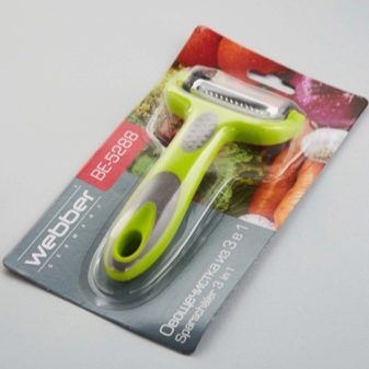 - Webber BE-5288 - manufacturer Germany. Another manual model of a piller. It features compact size, light weight and convenient operation. Suitable for cleansing both solid root crops and soft fruits and vegetables. The thickness of the cut layer does not exceed 3 mm. It has three blades, which allows not only to clean, but also to cut already peeled products with cubes. The rubberized handle protects the pilot from slipping in the hand and causing accidental injuries.