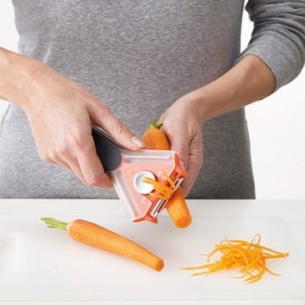 - The integrity of the disks for cleaning and the availability of spare parts in the kit. The richer the configuration of the piller is, the wider the scope of its use will be, which means that the easier it will be to work in the kitchen. If the knife has extraneous notches, inaccuracies or cracks, then such a peeler will not last long, and it is unlikely to be convenient and safe to work with.