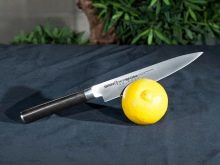 Today Samura is the result of modern production, which uses the best grades of Japanese and Swedish steel.hardened to a hardness of 58 - 61 HRC. Blades of a traditional Japanese form, with a subtle reduction from the butt, provide the famous fantastic cutting performance (fantastic cutting effect).