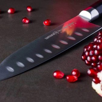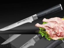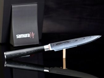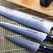 Samura knives made of Damascus steel are durable, flexible and equipped with a perfectly sharpened blade. Here, high quality is ensured by combining and creating multilayer products from various grades of high-carbon and alloy steels (for example, a series of five-layer Super 5 knives). These products are characterized by a characteristic layered structure of the blade, which provides both strength and beauty of the product. The manufacturing process is time consuming and involves a number of stages, which affects their relatively high cost. However, a long service life justifies the purchase of these knives.