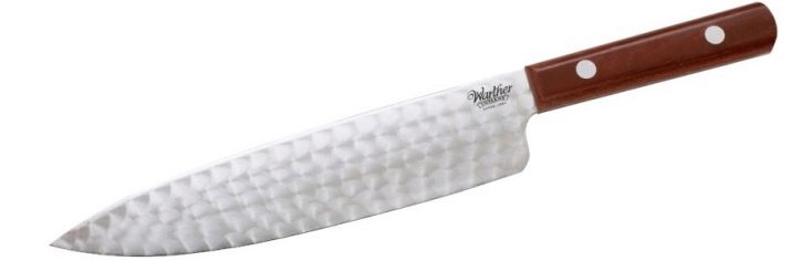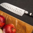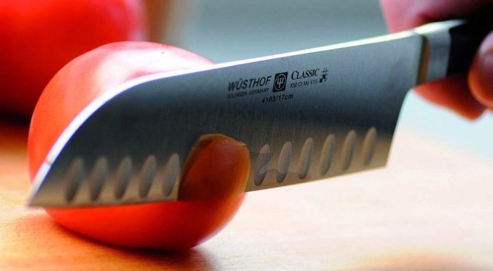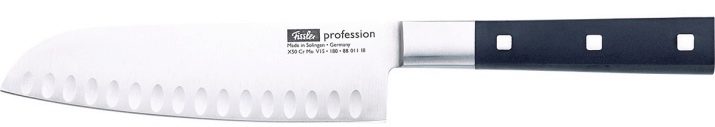 Santoku is extraordinarily sharp. Through holes of the blade prevent sticking of chopped food to the blade. But this product is not suitable for those who appreciate heavy knives. The method of execution of the tool (inserting the blade into the handle without a guard) is not reliable enough. Over time, the joints may become loose.