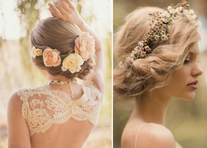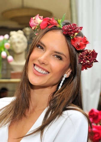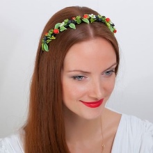 Hoops with flowers do not go out of fashion. It can be a laconic accessory decorated with just one blooming color, or it can be a wreath filled with buds around the entire perimeter. Additionally, they are decorated with peas, leaves and berries, placing them in between the flowers.