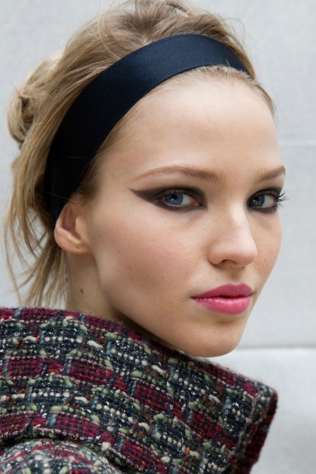 This year, designer hoops literally amaze with their variety. Chanel Fashion House offers to decorate the hairstyle with a wide black ribbon-bandage, while fixing the hair on the back of the head with a stylish hair clip.
