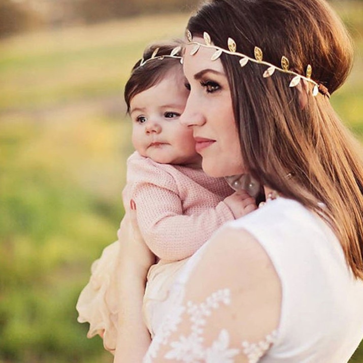 Most often, for mothers and babies, designers create hoops or wreaths of flowers that are suitable for beautiful ladies of any age. They will look great in everyday and holiday bows.