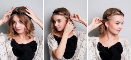 Then a small strand of hair is separated from either side and curled into a braid. She needs to wrap the hoop behind, completely covering the elastic. It is desirable to straighten the curls, forming a roller, and hide the end under the elastic band and secure with invisibility.