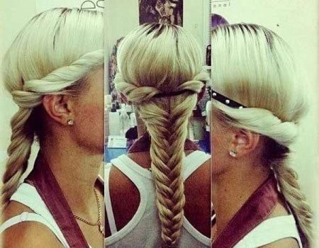 After that, you can braid any braid (French, spikelet, fish tail). In this case, the hair is selected, closing the rim. A volumetric braid, fixed at the bottom with a thin silicone rubber, will also look beautiful.
