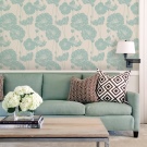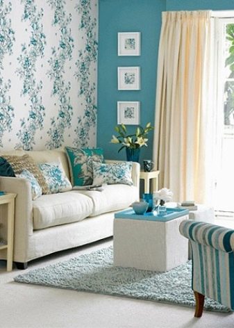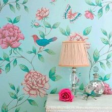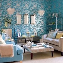 - Textile wallpaper with a colorful floral print. In the color basis of these wallpapers, two shades - sky blue and grass green. There are peach, beige, and lemon varieties, but the first two are more popular. They are also suitable for one accent wall in the living room.