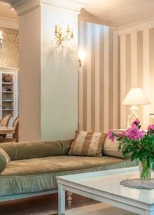 If you prefer bright, dominant wallpapers only against the wall where the sofa stands, Find a certain color roll call in the color of the sofa and wallpaper. For example, a faded yellow sofa finds a design answer in faded yellow stripes on wallpaper, or flowers, or ornament elements, and so on.
