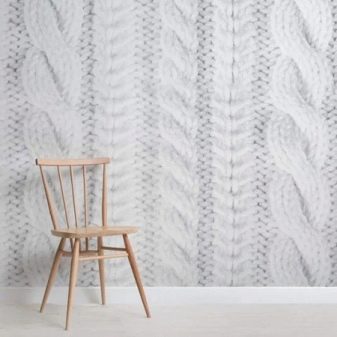 - "Knitted" light wallpaper. This is a wallpaper with print or even photo knitting of various sizes. For the whole room, the solution may be too bold, but for one wall, especially the one where the sofa is, this is a great choice. Cozy, unexpected, warm, bright, unusual - these are the words that can characterize a transformed room.