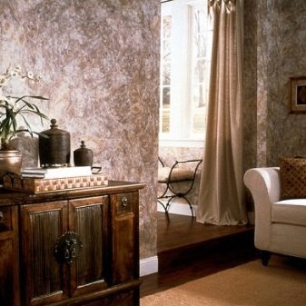 - Liquid. This is a cross between directly wallpaper and stucco. In fact, even this is just decorative plaster, but because of the compositional features it is customary to call it wallpaper. This is a dry powder that needs to be diluted with water and brought to a certain consistency. And the already obtained composition is applied to the wall like plaster. Such a coating does not form joints at all, provides excellent sound insulation, does not attract dust, always original.