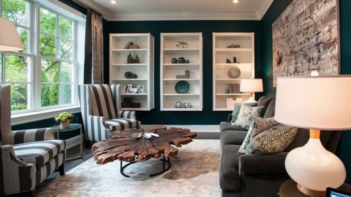 - Dark green wallpaper with a blue undertone. Could go well with white furniture, but the owners, in addition to white shelves, have striped chairs, a gray sofa and an original wooden table. And all together it looks organic. But in this combination there are a lot of tricks.