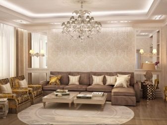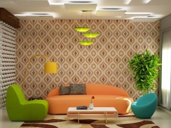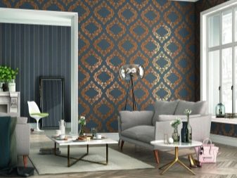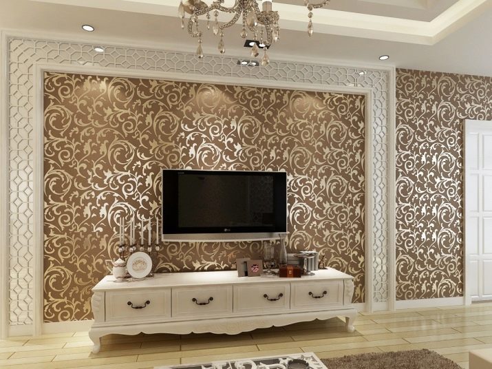 When combining, you should be able to combine colors. A flat wall of light tone with a changing image in color will look good. Glossy ornaments create glare in the light and accentuate the look, straight lines make the room bigger, and ceilings higher, increased motifs fill the voids of large-scale halls.