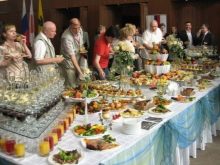 - Buffet Lunch. Snacks and dishes are located on separate tables, the reception participants impose treats that they like, and then they step aside, giving way to other reception participants. It is possible to place with the chosen treats on armchairs or small 4-6-seater tables in the same or neighboring room.