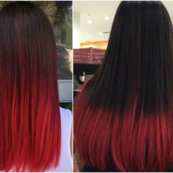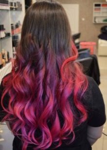 The ombre uses the most unusual colors, from red to purple or pink. When implementing ombre, the natural color will be overlapped with a new tone. For example, real brunettes at the ends of the hair will not have a dark shade.
