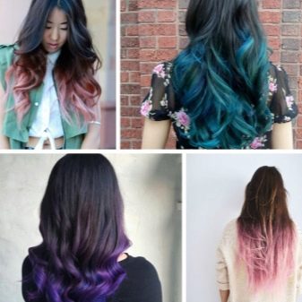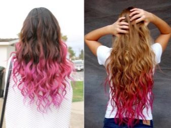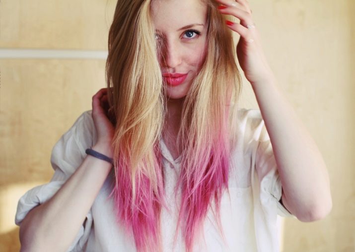 Dip dye popular with young girls, as this technique looks slightly sloppy and very bright. It looks as if the ends of the hair were simply dipped in paints of different colors, not caring for smooth transitions and observing the gradient. Shades are always taken flashy and non-standard.