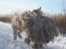 The Komondor is a large and massive dog that has similarities with the Magyar Shepherd Bullet. A newborn puppy of the Hungarian Shepherd has a soft down coat and soft hair, but in the process of growing up, the dog gets rid of the undercoat, and instead of the hair from the hair starts to become covered with long hair in the form of spirals. At the age of one and a half to two years, the dog is completely covered with dense rigid plaits, which are his fur coat.