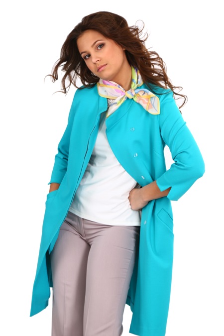 Summer loves bright colors! A stylish turquoise coat goes well with a set of white t-shirts and light trousers. A bright neckerchief was used as an accessory.