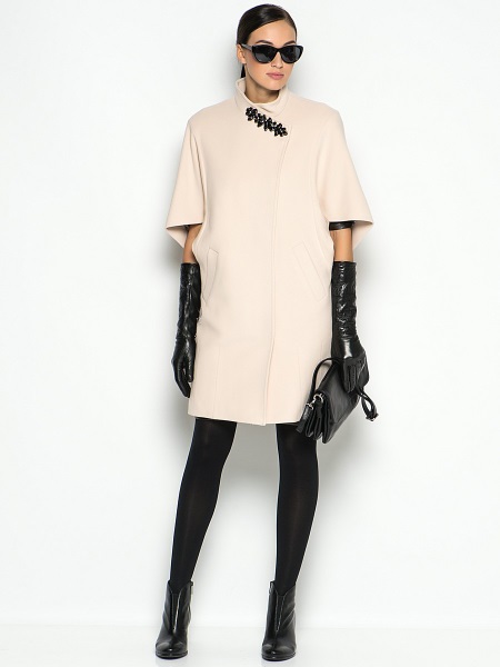 An elegant cropped coat will be the perfect complement to the business lady’s wardrobe. A very delicate, light shade of the model looks beautiful against the background of tight tights, ankle boots, long gloves and a black handbag. The coat is decorated with a black decorative element.