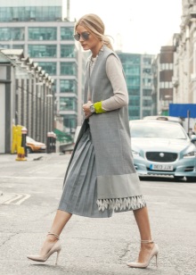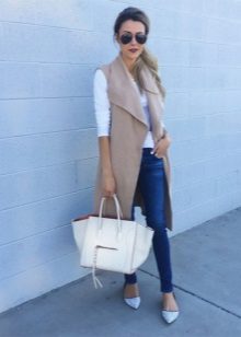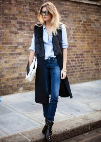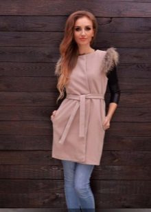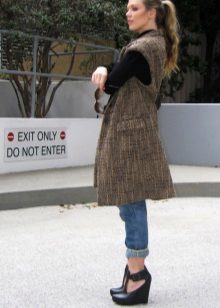 As with regular coats, a rule should work with a sleeveless coat: one thing should be voluminous. If your coat has a flared style, then choose narrow jeans, trousers or pencil skirts.
