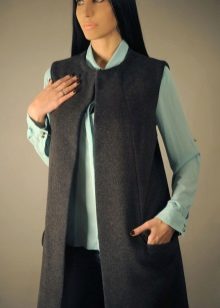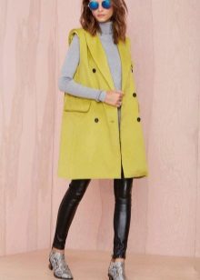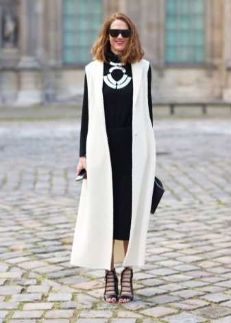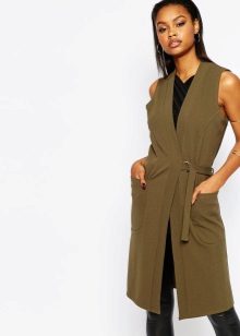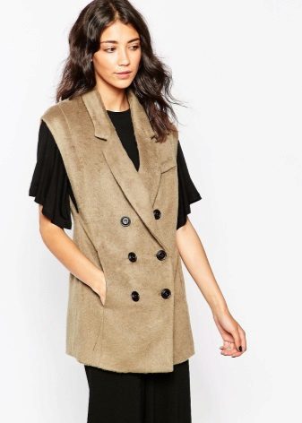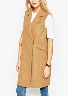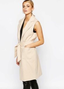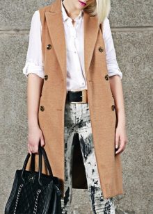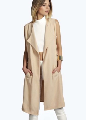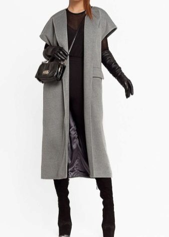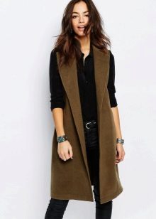 A sleeveless coat can be, like a real coat, short (very much like a vest), medium length (this length accounts for most of the variety of such coats) and very long (which is especially suitable for tall girls).