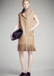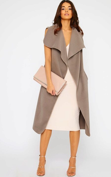A summer coat without sleeves almost without a collar, but with large lapels of the shelves themselves, the color of coffee with milk looks extremely elegant with a light dress, a large clutch in tone and sandals.
