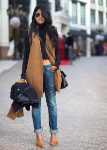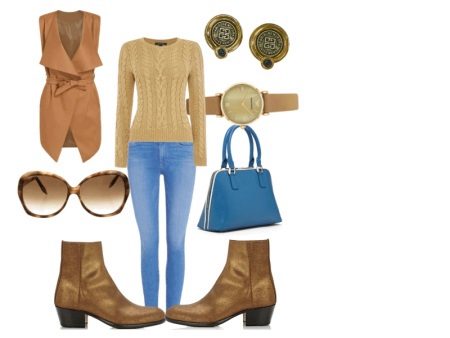 In already quite cold weather - a sweater with braids of warm sand color and a brown semi-fitted coat without sleeves and a collar, with wide tops of shelves in front with a belt of the same color just looks amazing with narrow jeans in blue, ankle boots made of ocher color material. You will be even more elegant if you take as an accessory a bag a tone darker than jeans and sunglasses in a horn-rimmed tortoise color.