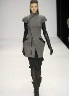 - A trapezoidal coat of gray-blue color with a wrap, a wide shawl collar, decorated with black lace, complemented by wide trousers with lapels of the same color and black gloves to the elbow - a somewhat unexpected, “pajama” version from Antonio Marras.