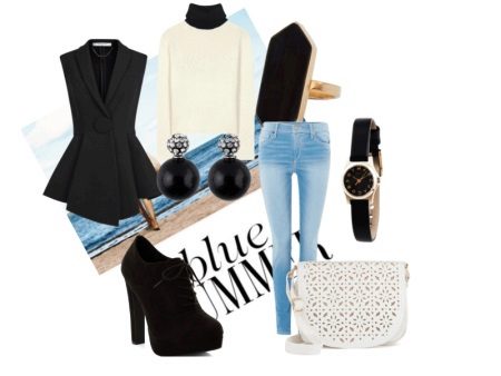No less elegant and sophisticated look, but cooler by the weather, you will have a black short coat with a detachable peplum skirt at the waistline and a black and white high-necked sweater. This also includes shabby blue skinny jeans and closed suede high-heeled shoes with ribbon lacing. A small bag made of perforated leather with a long strap, large jewelry and watches harmoniously complement the image of a confident lady.