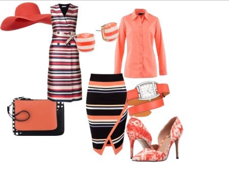 A stylish option for a walk is a striped sleeveless coat, the style of which imitates a wraparound dress, a striped pencil skirt that also imitates an odor, a salmon-colored shirt blouse, stilettos with coral-white stains. Large stripe jewelry in the same strip, a long coral-colored watch, a small tablet bag and ... a bright red hat. Calm shocking - why not a name for a new style?