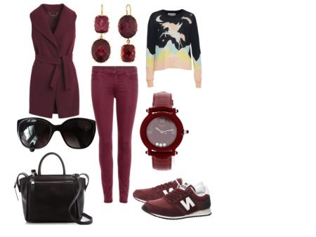 A sleeveless coat is not a stranger to even a sporty style - a burgundy coat with a shawl collar and a wide belt, skinny jeans, matching sneakers and a bright sweater with a pattern. Accessories are a burgundy watch, black sunglasses and a medium-sized black bag.