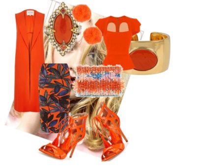 And the outfit for the most daring - all in an orange-red palette: from sleeveless coats in the same style of Victoria Beckham and a skirt with a tropical floral pattern to orange sandals made of stiletto heels.
