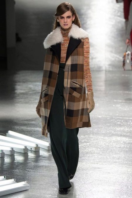 - A checkered zipped overcoat with a white fluffy collar, worn over a thin checkered sweater, complemented by leather gloves, loose high-waisted trousers and flat-bottomed boots is an extremely cozy looking look from Rodarte.