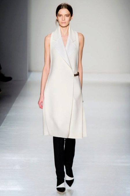 - And again, unsurpassed Victoria Beckham - an ivory summer sleeveless coat with an elegant clasp on the side. Fashionable, recognizable style.