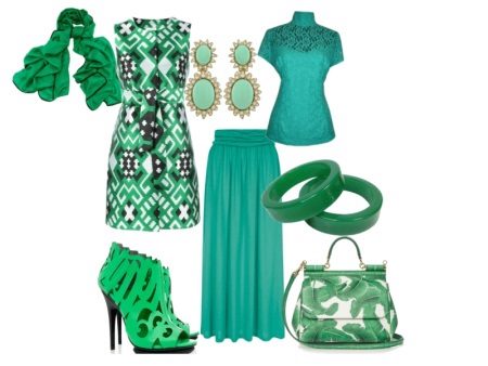 Another summer option in which you will definitely not go unnoticed - a green coat without sleeves and a collar, medium length, with a spectacular geometric pattern, on a wide belt, perfectly combined with a long turquoise skirt of soft knitted fabric and a lace t-shirt with short sleeves of one colors with a skirt. In addition - a green fabric scarf, green ankle boots made from cut-out leather on a stiletto heel, large plastic bracelets, silver turquoise earrings and an elegant bag in white and turquoise colors.