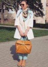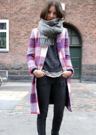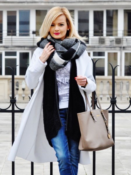 Here is an example of a perfect look in every way. The white coat is shaded by a black sweater and blue jeans. A wide scarf in a large cage is tied in the form of a free twist with hidden ends. The rule of three colors was not observed in this image, but because of this it did not deteriorate, on the contrary, it emanates femininity, lightness and ease.