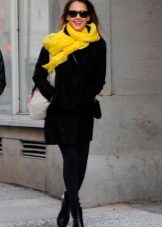 A monochromatic coat of a calm color will look more interesting if a soft twist is formed from a scarf one revolution. A thin strip formed from a scarf is ideal for a business look. In this method, you can use a brooch or form a tie or any other knot.
