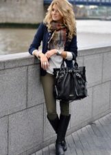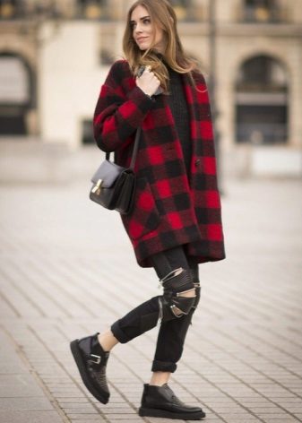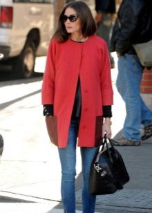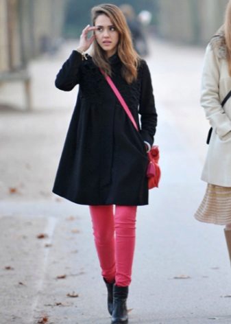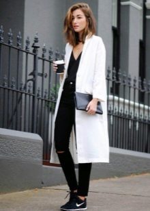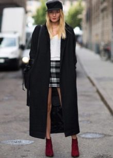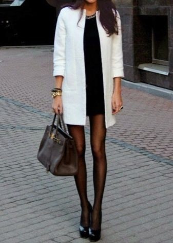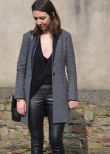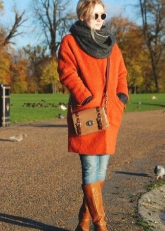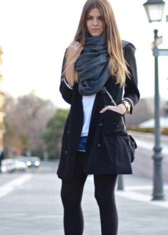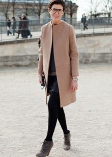 There are a number of clothes that under no circumstances can be combined with a coat without a collar. These include leggings, jeans that have nothing to do with classics (light, wide, flared, with scuffs), skirts with mini and maxi lengths, and over the knee boots.