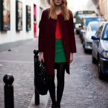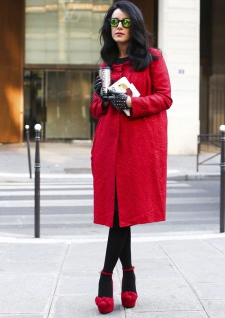 A bright coat should not merge with the color of other clothes. If you really want to create an image in a single color, then you need to take care of the transition of shades, which should be clear and expressive.