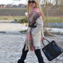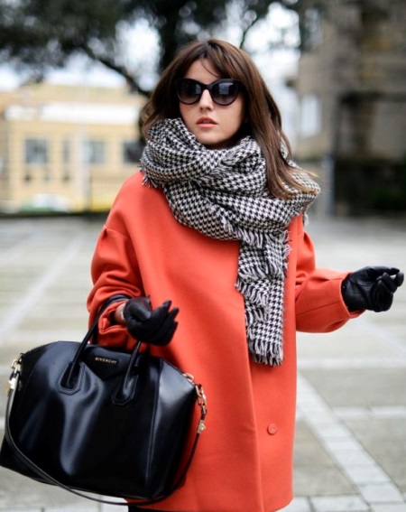 Moderately vivid image, created on the basis of a coral coat of a free cut. A wide scarf in a small black and white print resonates with a black bag, gloves, glasses and high boots. Everything in this image is thought out to the smallest detail, because it seems harmonious, holistic and complete.