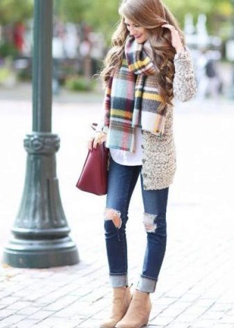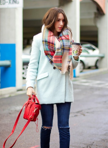 We said that you can’t wear ripped jeans with a coat without a collar, but you can find exceptions for every advice, and we have been given the rules to break them.The creator of this image decided to take a chance and show her personality, combining dark skinny jeans with sexy slits on her knees with a milk cashmere coat. This experiment was a success for her, it should be noted. And how harmoniously a multi-colored scarf looks here, which is matched to a handbag.