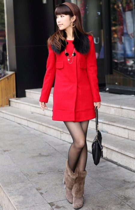 If your coat without a collar has average length, then he will need to pick up long dresses, straight skirts and restrained shoes, for example, high boots will be a very good option.