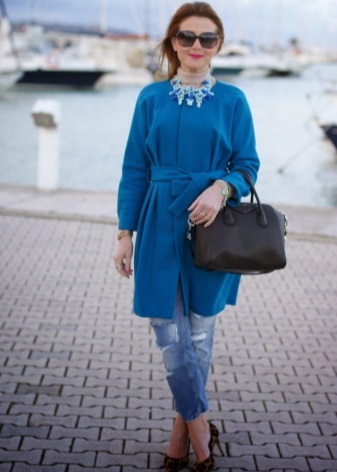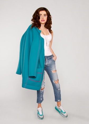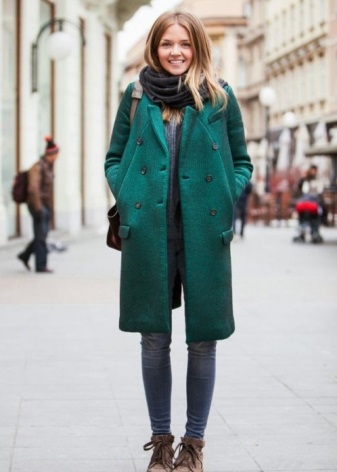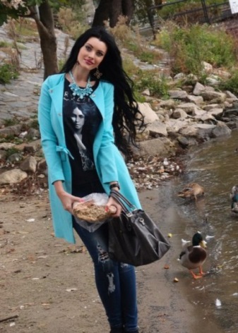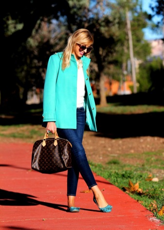 - turquoise coats look very harmonious with blue and blue skinny jeans and light sweaters, complemented by a warm or light scarf of a gentle shade;
