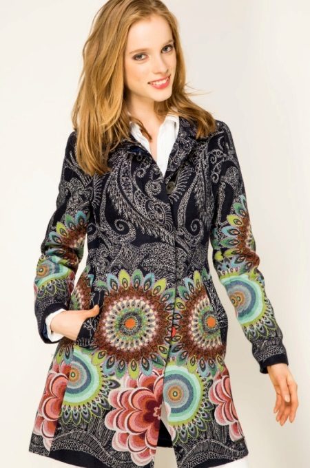 Coat Desigual - a combination of crazy color play, an unusual combination of colors and textures. Various prints, ornaments, watercolor drawings, hand embroidery - this is what distinguishes the brand from other brands.