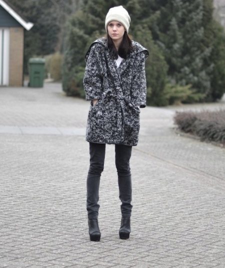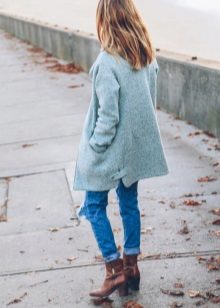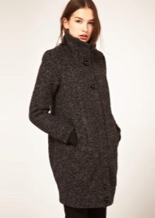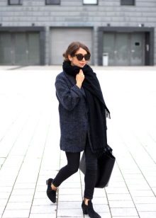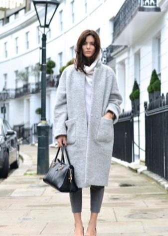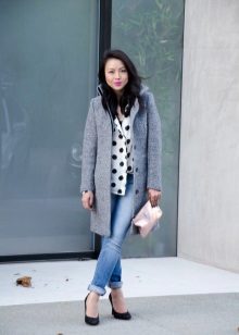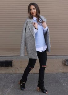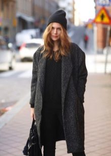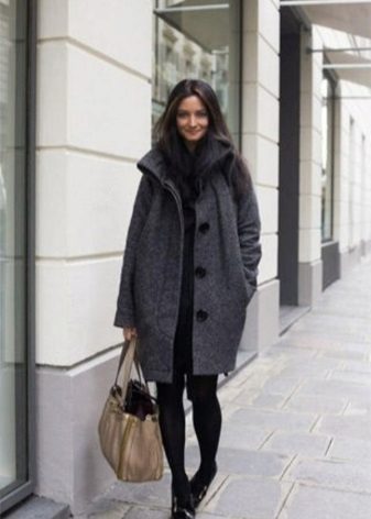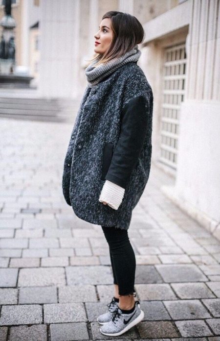 Coat - cocoon of unusual color with a turn-down collar goes well with things of a sporty style. A snood scarf is chosen under it, the color of which perfectly harmonizes with the smoky shade of outerwear. Soft lines of the product emphasize its comfort. This style is suitable for any figure.