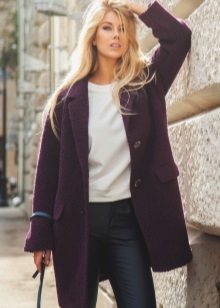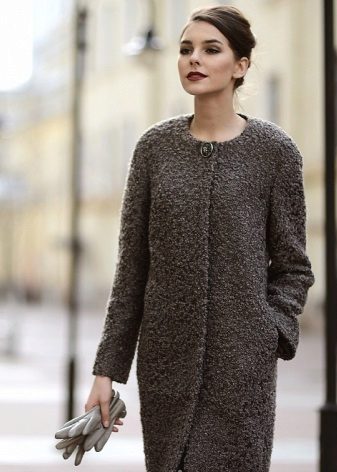 A bright boucle can look cheap, and this fabric can lose its special flavor. Therefore, for the coat, fabrics of muted shades are most often selected. This season, burgundy, dark green, purple and jade shades are very popular. Of the calm colors, preference is given to gray, brown and chestnut.