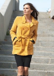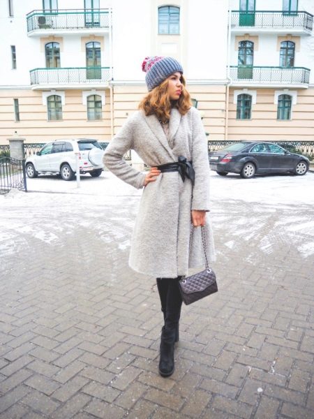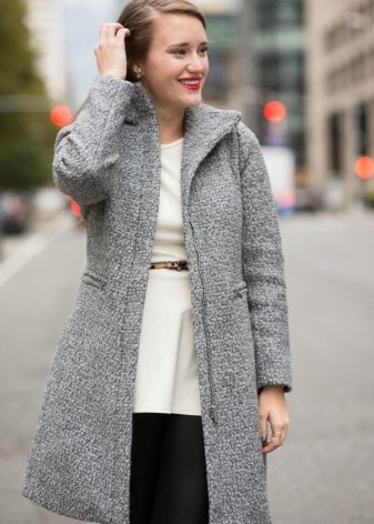 Another favorite model by many is a fitted coat. It is believed that a coat of boucle looks voluminous. This visual image can be softened with a belt. Stylists recommend the use of leather and suede belts. It looks especially feminine on long models of a coat with a V-neck.