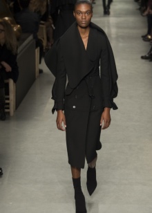 Classic narrow trench coats are an invariable classic of any collection. This season, a designer look attracted an animalistic print. Among the materials involved in the design, designers use calfskin with a lamb leather backing. A lush sleeve at the top of this color adorns the strict lines of the product with a small collar. The onion from the buffalo horn will complement the onion.