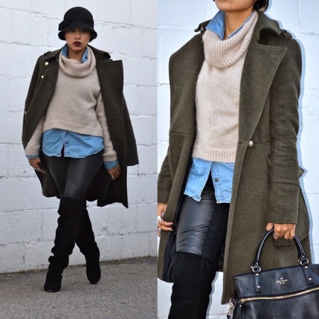 - with contrasting sweaters with a high neck, provided that the pea coat has a classic black or brown color;