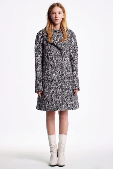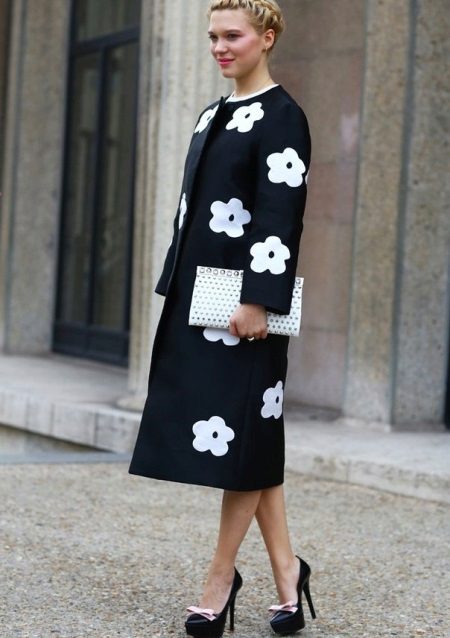 Black and white coat - in a large or small cage, in a goose foot, "under the zebra", with different prints. Very original models with one hollow white and the second black. An interesting solution is a white coat with large patch black pockets, a collar and black fabric cuffs. Styles may be many. The only remark is that the more complex the print or decor, the easier it should be to cut the coat itself.