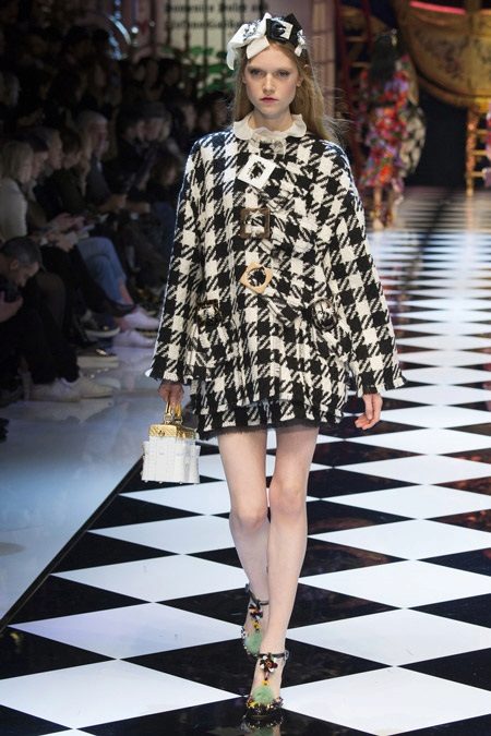 Black-and-white dominoes of loose fit without collar with unusual large buttons, buckles from Dolce & Gabbana.